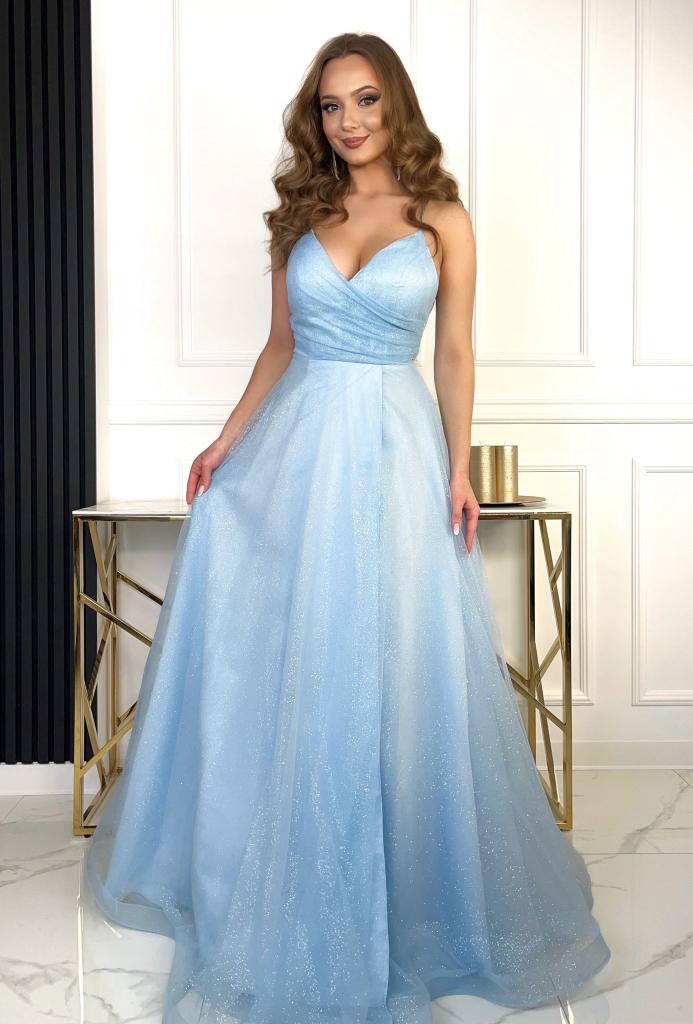 Dlouhé společenské tylové šaty . Na ramínka, na zadní části šněrování. Na sukni je rozparek. Barva: bleděmodrá